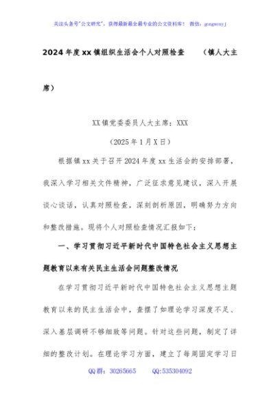 / 2024年度xx镇党委组织生活会个人对照检查材料(镇人大主席)