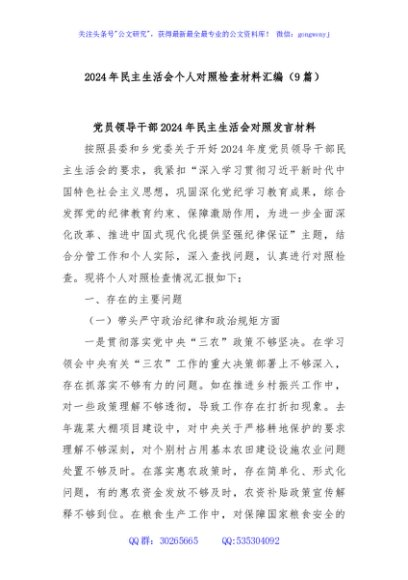 / (9篇)2024年民主生活会个人对照检查材料汇编