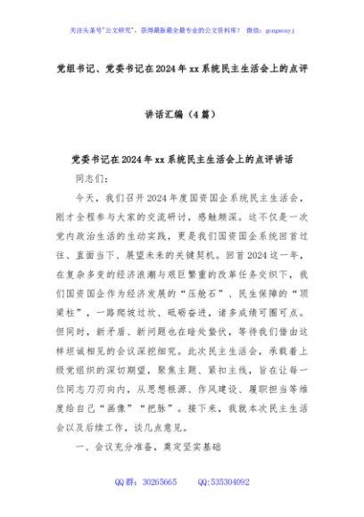 / (4篇)党组书记、党委书记在2024年xx系统民主生活会上的点评讲话汇编