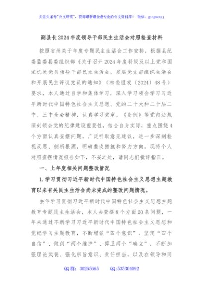 / 副县长2024年度领导干部民主生活会对照检查材料
