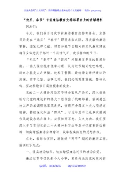 / “元旦、春节”节前廉洁教育安排部署会上的讲话材料