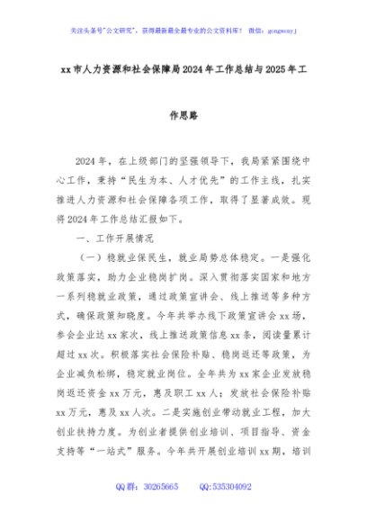 / xx市人力资源和社会保障局2024年工作总结与2025年工作思路