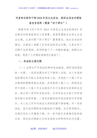 / 市直单位领导干部2024年民主生活会、组织生活会对照检查发言材料(聚焦“四个带头”)
