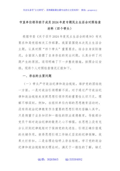 / 市直单位领导班子成员2024年度专题民主生活会对照检查材料(四个带头)