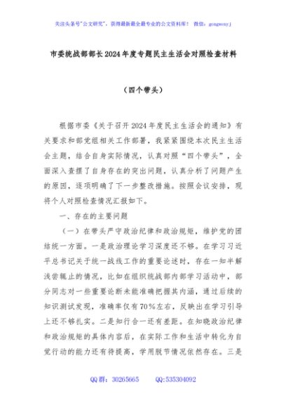 / 市委统战部部长2024年度专题民主生活会对照检查材料(四个带头)