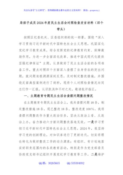 / 局班子成员2024年度民主生活会对照检查发言材料(四个带头)
