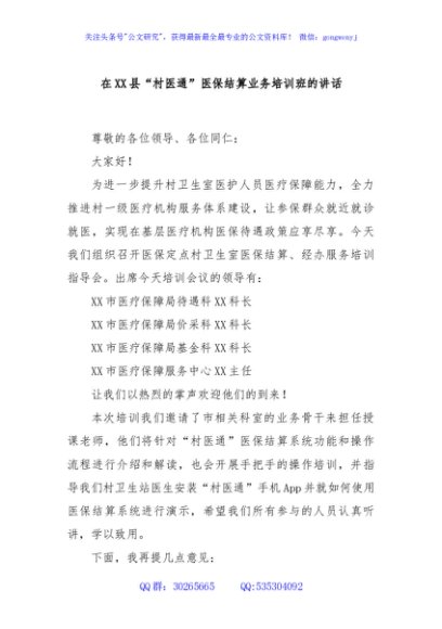 / 在XX县“村医通”医保结算业务培训班的讲话