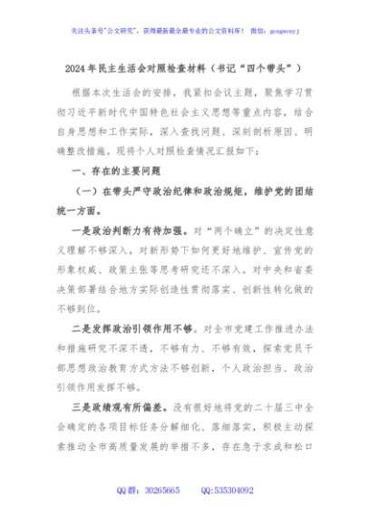 / 2024年民主生活会对照检查材料(书记“四个带头”)
