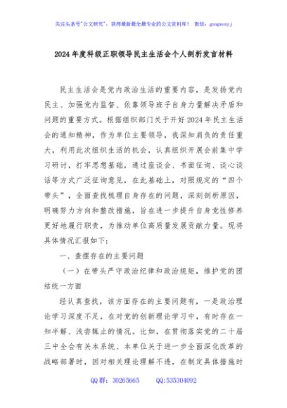 / 2024年度科级正职领导民主生活会个人剖析发言材料