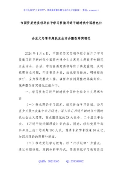 / 市国资委党委领导班子学习贯彻习近平新时代中国特色社会主义思想专题民主生活会整改落实情况
