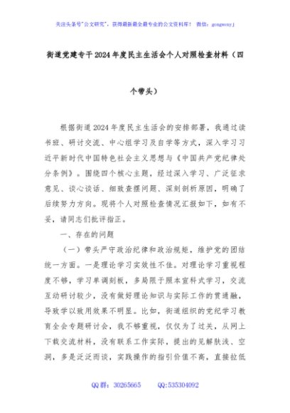 / 街道党建专干2024年度民主生活会个人对照检查材料(四个带头)