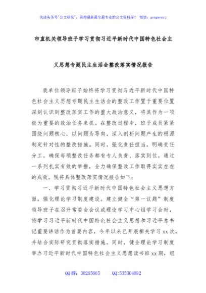 / 市直机关领导班子学习贯彻习近平新时代中国特色社会主义思想专题民主生活会整改落实情况报告