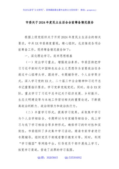 / 市委关于2024年度民主生活会会前筹备情况报告