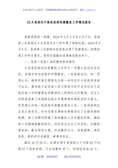 / XX乡党委关于落实县委巡察整改工作情况报告