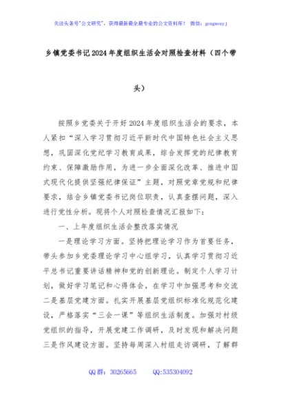 / 乡镇党委书记2024年度组织生活会对照检查材料(四个带头)