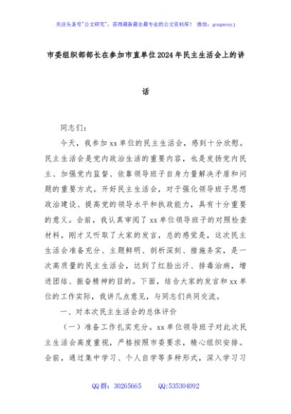/ 市委组织部部长在参加市直单位2024年民主生活会上的讲话