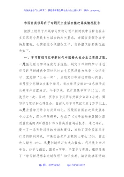 / 市国资委领导班子专题民主生活会整改落实情况报告