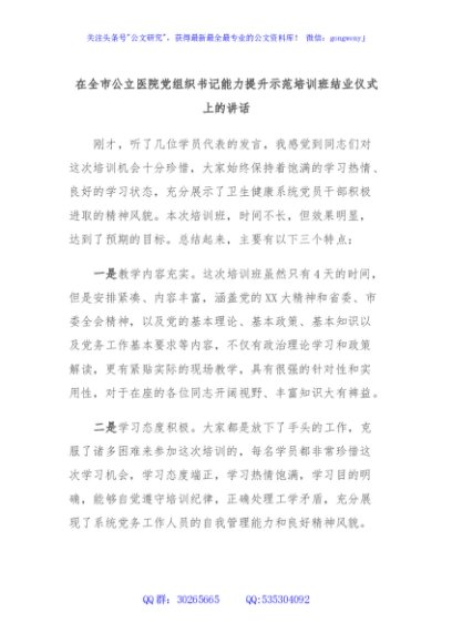 / 在全市公立医院党组织书记能力提升示范培训班结业仪式上的讲话