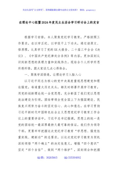 / 在理论中心组暨2024年度民主生活会学习研讨会上的发言