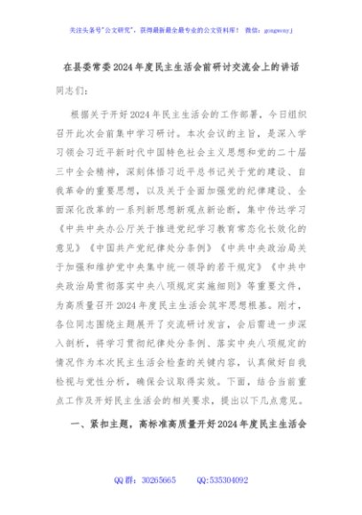 / 在县委常委2024年度民主生活会前研讨交流会上的讲话