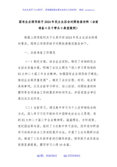 / 国有企业领导班子2024年民主生活会对照检查材料(会前准备+五个带头+典型案例)