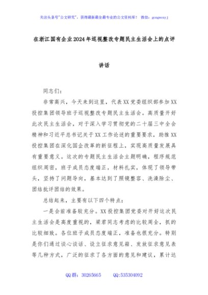 / 在浙江国有企业2024年巡视整改专题民主生活会上的点评讲话