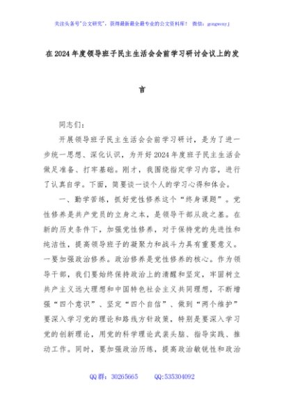 / 在2024年度领导班子民主生活会会前学习研讨会议上的发言