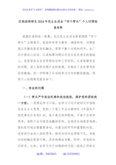 / 区统战部部长2024年民主生活会“四个带头”个人对照检查材料