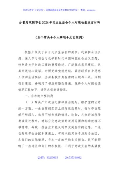 / 分管财政副市长2024年民主生活会个人对照检查发言材料(五个带头+个人事项+反面案例)