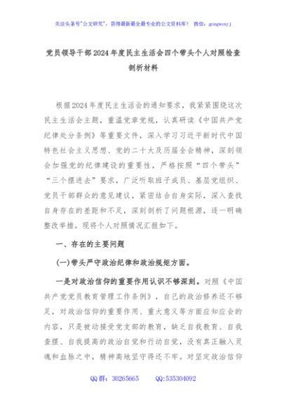/ 党员领导干部2024年度民主生活会四个带头个人对照检查剖析材料