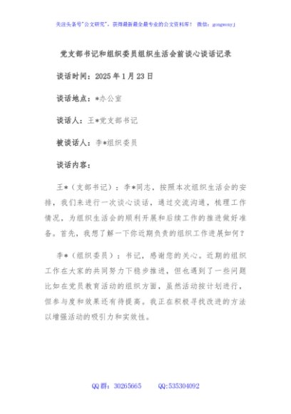 党支部书记和组织委员组织生活会前谈心谈话记录