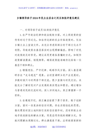 / 乡镇领导班子2024年民主生活会之间互相批评意见建议