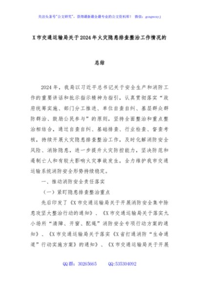 / X市交通运输局关于2024年火灾隐患排查整治工作情况的总结
