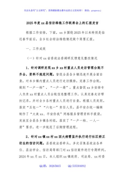/ 2025年度xx县信访维稳工作联席会上的汇报发言