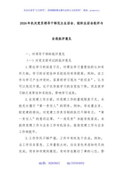 / 2024年机关党员领导干部民主生活会、组织生活会批评与自我批评意见