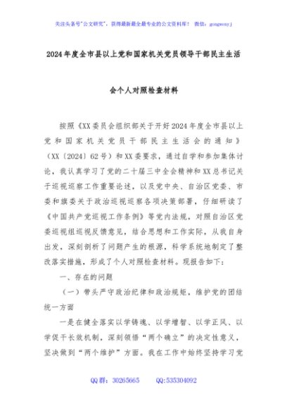/ 2024年度全市县以上党和国家机关党员领导干部民主生活会个人对照检查材料
