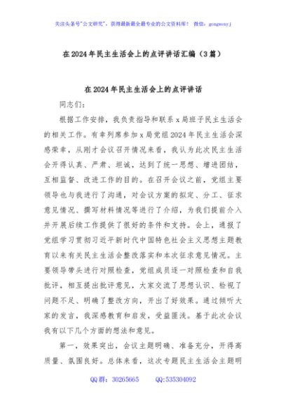未生成预览图,长按二维码添加 (3篇)在2024年民主生活会上的点评讲话汇编 - 公文研究