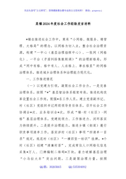 / 某镇2024年度社会工作经验发言材料