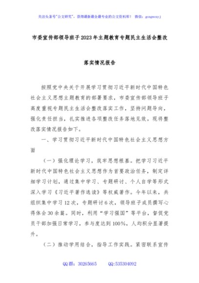 / 市委宣传部领导班子2023年主题教育专题民主生活会整改落实情况报告