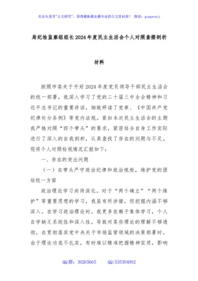 / 局纪检监察组组长2024年度民主生活会个人对照查摆剖析材料