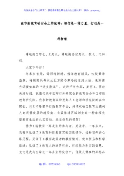 / 在市新教育研讨会上的致辞:相信是一种力量,行动是一种智慧
