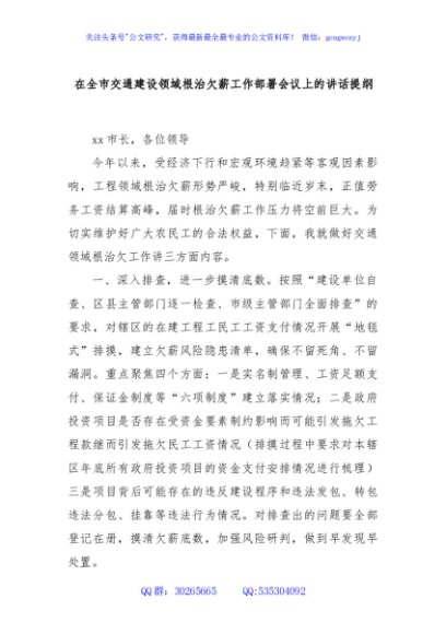 / 在全市交通建设领域根治欠薪工作部署会议上的讲话提纲