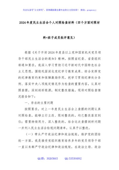 / 2024年度民主生活会个人对照检查材料(四个方面对照材料+班子成员批评意见)
