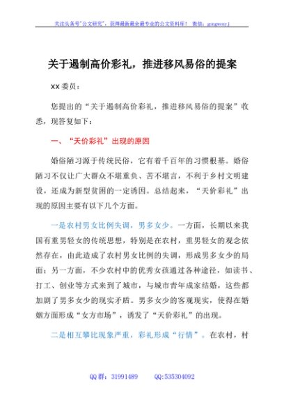 / 关于遏制高价彩礼,推进移风易俗的提案