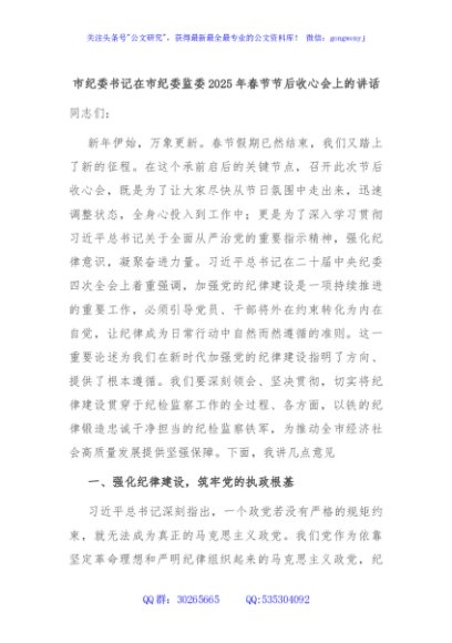 / 市纪委书记在市纪委监委2025年春节节后收心会上的讲话