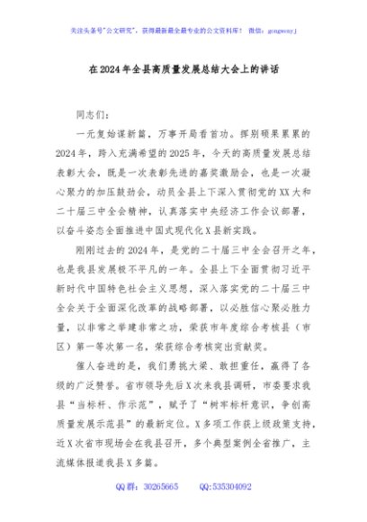 / 在2024年全县高质量发展总结大会上的讲话