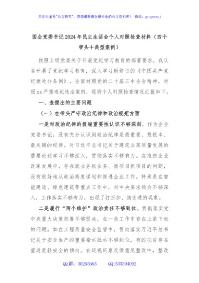 / 国企党委书记2024年民主生活会个人对照检查材料(四个带头+典型案例)