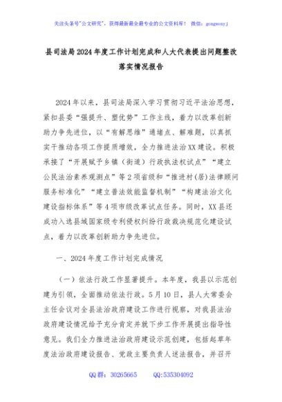 / 县司法局2024年度工作计划完成和人大代表提出问题整改落实情况报告