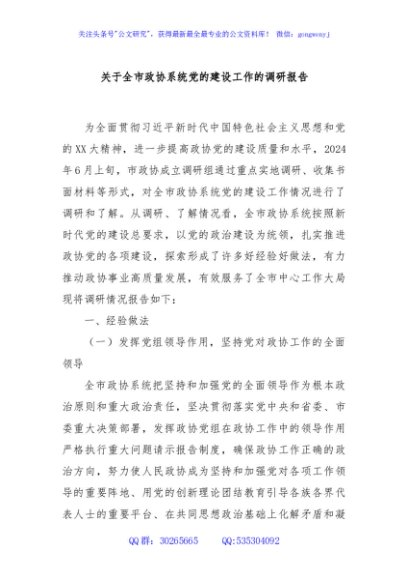 / 关于全市政协系统党的建设工作的调研报告