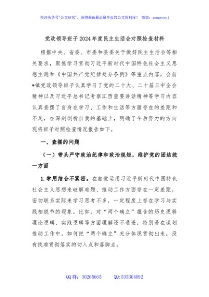 / 党政领导班子2024年度民主生活会对照检查材料